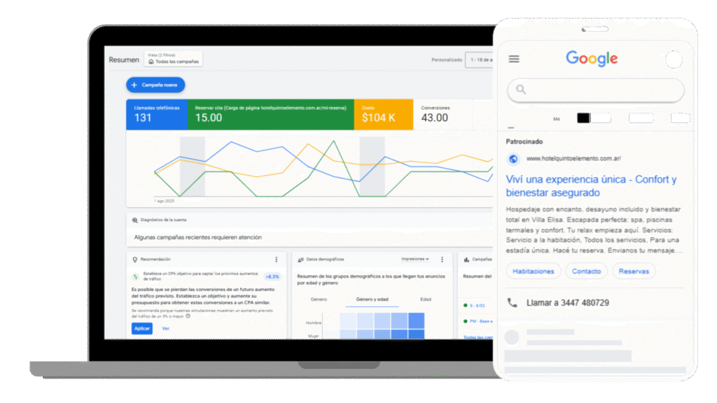 En solo 15 días de inversión en Google Ads ($104.000), logramos resultados concretos para el Hotel Quinto Elemento: